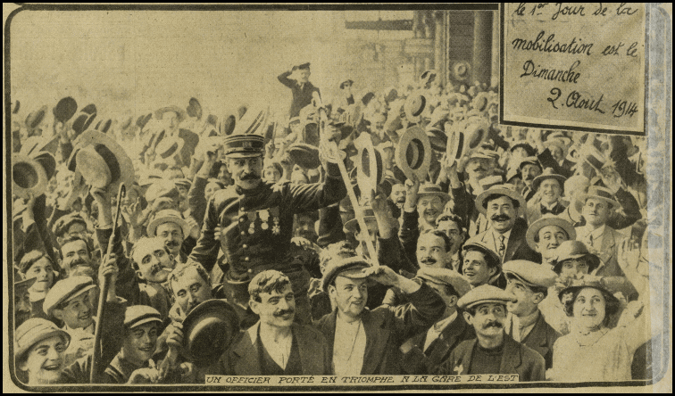 | Un officier porté en triomphe à la gare de l’Est. | Le 1er août 1914, la mobilisation générale est décrétée en France. Des scènes de liesse populaire apparaissent spontanément, notamment autour des gares. Ici, un officier est porté par la foule, gare de l’Est à Paris. |