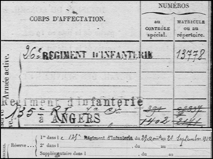 Dans l’exemple ci-dessous, ce soldat du Maine-et-Loire fut envoyé dans un régiment de l’Est, au 26e RI de Nancy-Toul. Une fois libéré du service actif, il fut versé au 135e RI comme réserviste, régiment d’infanterie effectivement le plus proche de son domicile de Grey-Neuville. C’est dans ce régiment qu’il fit sa première période d’exercices en 1912 et qu’il fut mobilisé en août 1914.