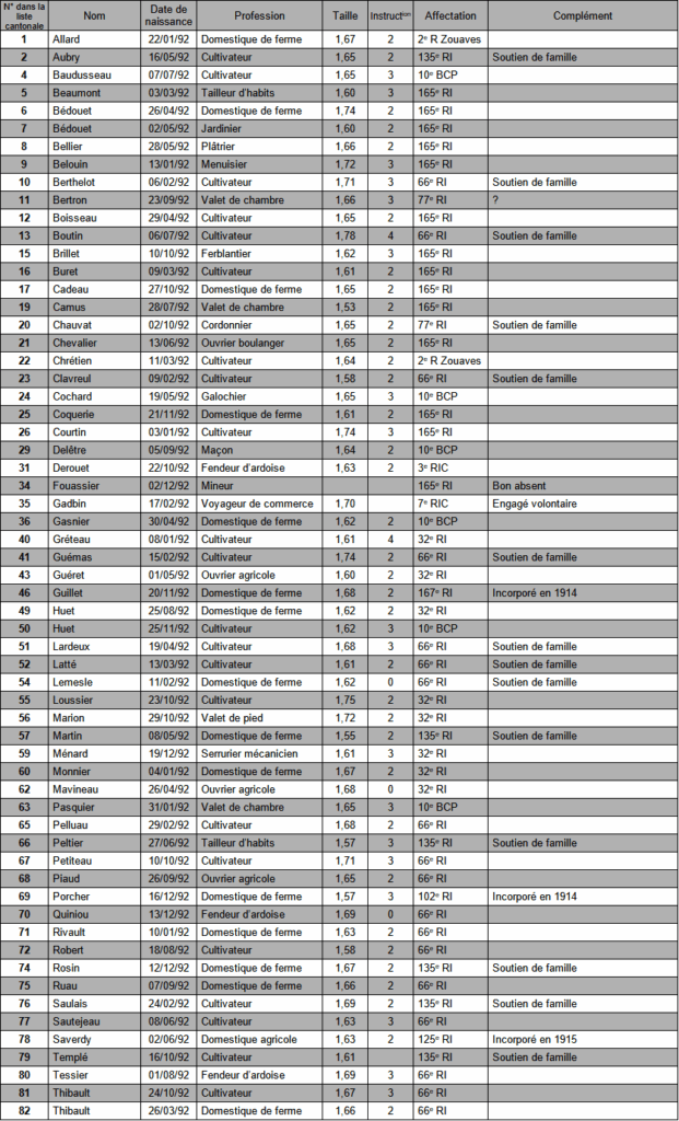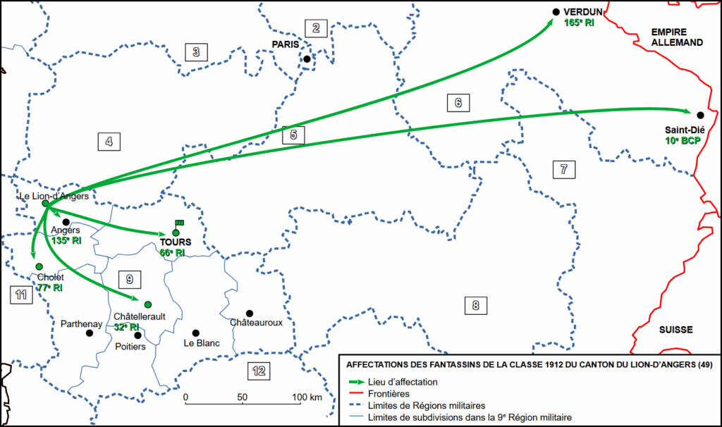 Pour la classe 1912, c’est la lettre « B » qui a été tirée au sort. Ainsi, à partir de la lettre B incluse, les hommes sont envoyés dans les régiments de l’Est. C’est bien ce que l’on constate dans la liste communale du Lion d’Angers pour cette classe, classée par ordre alphabétique et non plus par date de naissance. Les premiers sont envoyés au 165e RI ou au 10e BCP avant d’être enfin affectés dans les corps de la région militaire (9e).