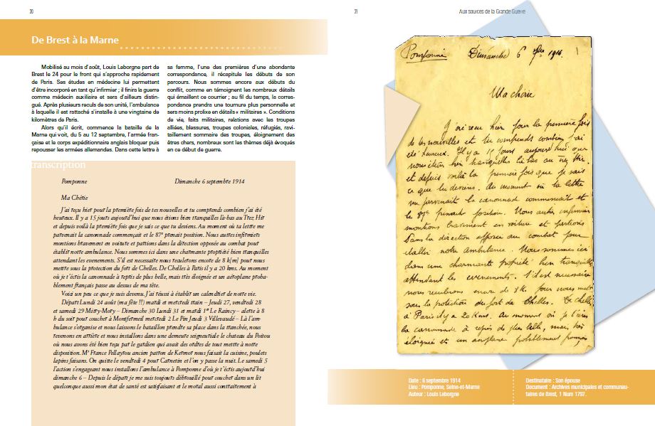 Le choix réalisé par les auteurs est simple : essayer, au travers de documents, d’aborder de grands thèmes liés au conflit, évoquer le front principalement mais aussi les familles à l’arrière. Pour rendre la lecture simple (sans être simpliste), chaque témoignage développe un thème et un seul. Chaque témoignage se compose comme dans l’exemple ci-dessous : une présentation du document expliquant l’essentiel, une transcription et sur la droite le document. Cette présentation varie en fonction du nombre d’illustrations et de la taille du document.