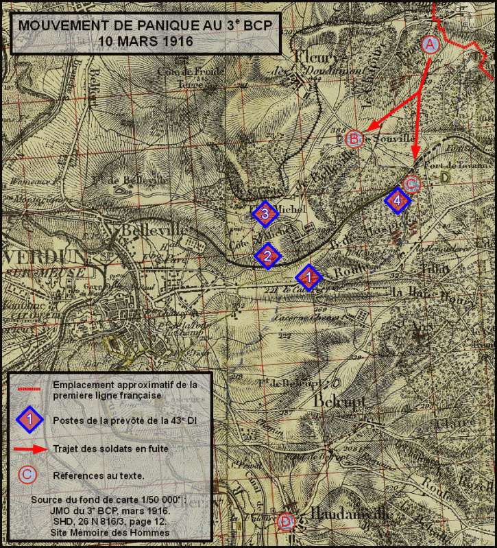 22 mars 1916 Rapport du chef de bataillon commandant le 3e BCP concernant l’abandon de leur poste par un certain nombre de chasseurs au Bois de Fumin, le 10 mars 1916. Le 9 mars 1916, le bataillon venait occuper vers 22h en réserve de Brigade, le bois Fumin (sud ouest de Vaux) ; bivouaqué déjà depuis 2 nuits, il avait en outre subi des pertes appréciables dans la journée du 9. La position de bivouac était dans un bois, cachée aux vues, mais en espalier vers l’ennemi ; on y créa dès l’arrivée des tranchées étroites et profondes destinées à abriter les chasseurs contre un bombardement éventuel. [A sur la carte] A partir de 10h, le 10, le bois est pris sous un feu d’une violence inouïe ; des rafales d’obus de 15 et de 21 s’y abattent ; immédiatement les pertes deviennent sérieuses, elles atteindront pour la journée près de 120 chasseurs tués ou blessés. Vers 17h30, le bombardement augmente encore d’intensité, des balles commencent à siffler dans toutes les directions ; à ce moment, le bivouac est traversé par des isolés d’autres corps ; les uns remontent de Vaux, d’autres revenant de la Redoute placée au Nord Ouest du fort de Vaux [ce secteur est attaqué à ce moment par les Allemands] : ces isolés qui fuient poussent en passant près des chasseurs le cri de « sauve qui peut. Voilà les Boches ». A ce cri, les chasseurs sortent de leur abri et quelques-uns, 60 à 80 peut-être, certains sans même prendre le temps de remettre l’équipement dont ils se sont séparés, énervés vraisemblablement par le formidable bombardement qu’ils viennent de subir s’échappent à travers bois. Cependant, les officiers ont sauté hors de leurs abris, rallié leurs unités qui attendent maintenant avec calme des ordres ; presqu’immédiatement quelques chasseurs honteux d’une défaillance passagère, rejoignent leurs unités ; par contre un certain nombre, une quarantaine peut-être, mêlés à des fractions d’autres corps continuent leur fuite et remontent vers les hauteurs du fort de Souville. Le 11 et le 12 mars, ces chasseurs sont arrêtés peu à peu, les uns près du fort de Souville [B sur la carte], les autres au tunnel de Tavannes (PC de la Division) [C sur la carte], quelques-uns même à Haudainville où se trouve le train régimentaire du bataillon [D sur la carte]. Les plaintes en Conseil de guerre ci-après ont pour but de remettre entre les mains de la justice militaire les chasseurs dûment reconnus coupables d’avoir fui dans les circonstances générales relatées ci-dessus.