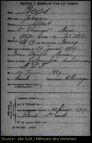 Comme il est parfois fait mention sur le forum Pages 14/18 de soldats allemands dans les fiches MDH, j’ai tapé « Boost Johann ». Et quelle ne fut pas ma surprise de trouver une fiche ! Il faut probablement y voir une simple coïncidence, une homonymie. Il s’agit d’un soldat allemand de la Légion au Maroc.
