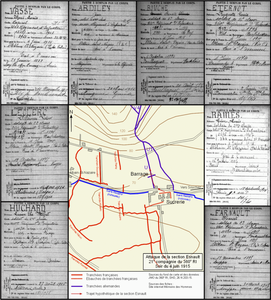 Le 4 juin, le 360e RI est en première ligne. Après de coûteux combats fin mai, le régiment relève le 279e RI à la sucrerie. Une maison au nord est toujours aux mains des Allemands. Une opération est organisée et à 16h00, une section (celle du sergent Esnault) de la 21e compagnie, prend ce dernier bâtiment. La section a aussi avancé d’une centaine de mètres dans la tranchée U qui se trouve au nord de la sucrerie et que les tirs français prenaient en enfilade. Arrêtés par les mitrailleuses au point V4 et par l’artillerie allemande, les soldats durent ensuite repousser plusieurs contre-attaques allemandes venant de Souchez dans la nuit (à 21h30 et 23h30).