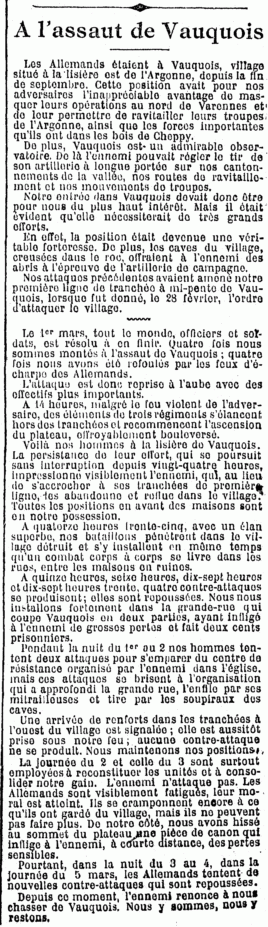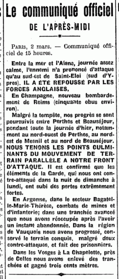 Journal Le Temps, 2 mars 1915 pour le communiqué du 28 février (soir) :