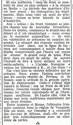 La vision donnée par la presse est celle donnée par les autorités : laconique, inexacte sans être réellement mensongère. La difficulté n’est pas cachée, mais est minoré. Des prisonniers ont été faits, des contre attaques repoussées. Cependant, le Bulletin des Armées ne cache pas la difficulté à prendre pied dans le village, les échecs subis. Certes, le discours est volontaire et positif, mais on est loin de la propagande aveugle, du bourrage de crâne visible dans de nombreux autres articles.