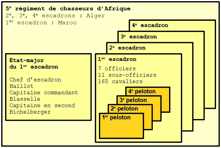 - Arrivée au Maroc et premières missions du 1er escadron du 5e Régiment de Chasseurs d’Afrique