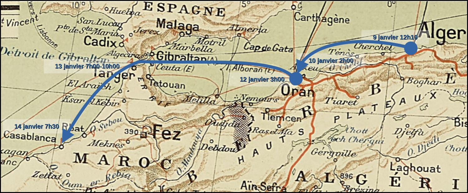 Le Moulouya leva l’ancre à midi 10. Voici son parcours1 :