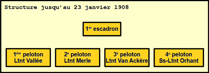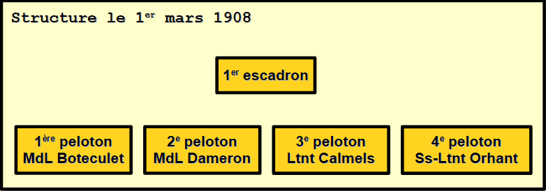 Le 1er escadron reçoit l’ordre de se tenir prêt à quitter son casernement le 26 décembre 1907. C’est un effectif de 150 sabres qui doit rejoindre Casablanca, auquel s’ajoutent 20 sabres devant compléter les effectifs des 1er et 3e escadrons du 3e RCA.