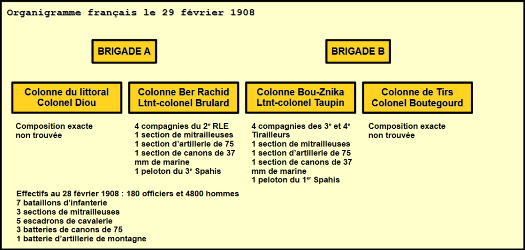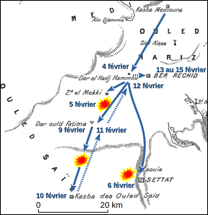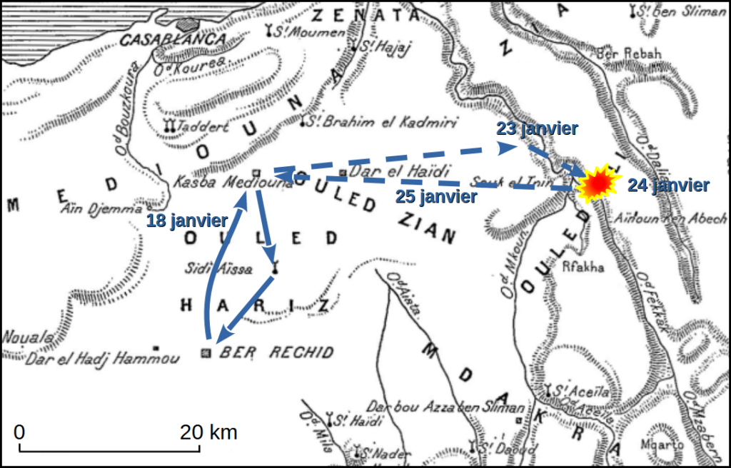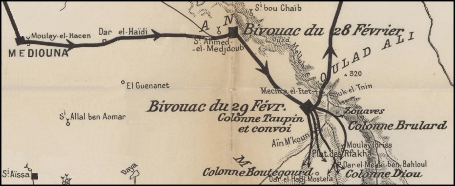 À trois heures du matin, les troupes se mettent en route vers le Sud. Chaque colonne a reçu ses instructions. La colonne Taupin s’installe à l’ouest d’un oued et protège le convoi. La colonne Brulard occupe le côté gauche du dispositif et la colonne Boutegourd la droite. Au centre, c’est la colonne Diou qui a va affronter rapidement les troupes marocaines.