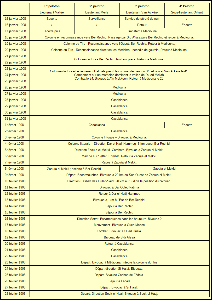 D’abord, il ne s’agit que d’escortes et de reconnaissances, mais le 19 janvier, l’escadron rejoint la colonne du Tyrs et les missions dans la Chaouia se succèdent, revenant le plus souvent au camp de la Mediouna. Il s’agit d’opérations visant à maintenir la pression sur les tribus locales ainsi que de créer des postes locaux, comme celui de Ber Rechid le 14 janvier2. Les accrochages avec les cavaliers marocains augmentent et l’escadron a ses premières pertes lors du combat du 24 janvier (2 blessés et le cheval Luisant tué).