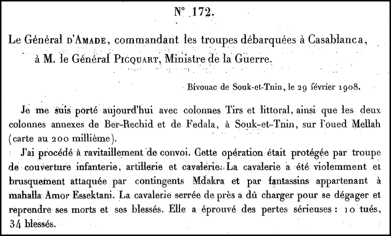 « Certains renseignements contraires à la vérité ont été mis en circulation au sujet des pertes subies par les colonnes du général d’Amade au cours du combat du 29 février 1908 à Souk-el-Trin.
