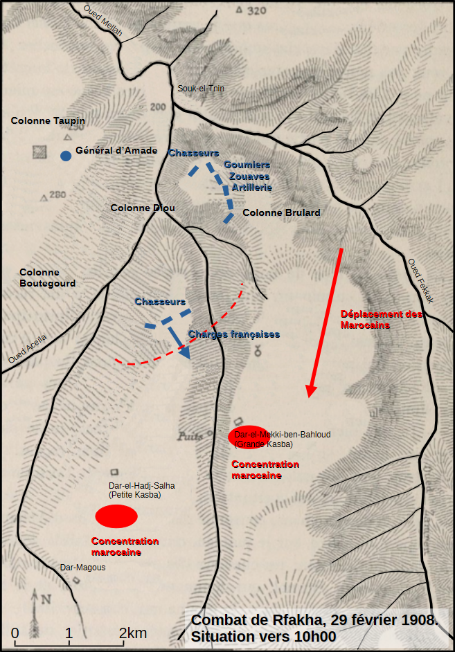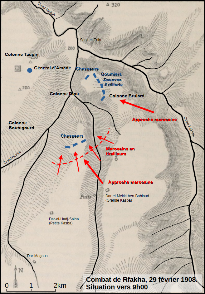 Vers 7h50, des coups de feu sont signalés contre l’arrière-garde mais aussi contre les escadrons des RCA. Les Marocains avancent vers le Nord et vers le Sud des colonnes. Le général d’Amade donne ses ordres : garnir le nord du plateau de Rfakha par un bataillon de Zouaves et une batterie de montagne ; au Sud, la cavalerie (peloton de Spahis, pelotons du 3e RCA) occupent la crête et surveillent le Sud-Est, bientôt rejoint par l’escadron du 5e RCA qui quitte le flanc-garde droit.