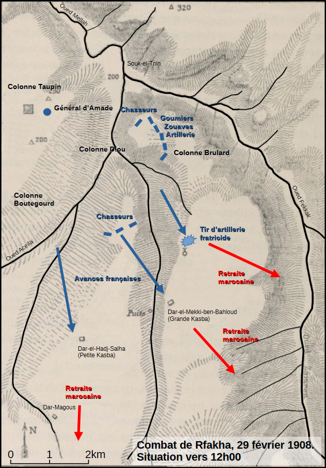 Le combat de Rfakha du 29 février 1908 montre que, loin d’être une promenade de santé, cette campagne fut marquée par des affrontements violents. Hélas, on ne dispose pour les comprendre que des sources françaises, du JMO des unités présentes aux témoignages publiés d’officiers. Rien du côté marocain. Cet article est à visée purement tactique et n’évoque pas la campagne et ses exactions.