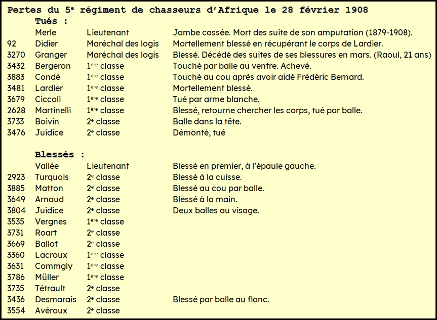 Dans son numéro du 14 mars 1908, 15 jours après les faits, L’Afrique du Nord illustrée donne même l’identité des tués et blessés du combat5.