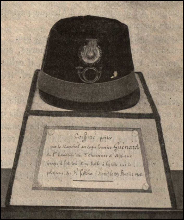 « Dans le lit de l’oued, j’aperçois une masse grisâtre au milieu des herbes; c’est un fantassin marocain vêtu d’une djellaba grise (…). Non loin de lui est un taconnet de chasseur d’Afrique plein de sang, que le misérable emportait à son douar après avoir mutilé le possesseur ; Mille le ramasse et l’accroche à sa selle pour le rendre à l’escadron ; il en aperçoit plus loin encore un autre que je lui fais prendre aussi. Je ne veux pas les laisser sur le terrain, où les Marocains les ramasseraient comme trophées (…). Le soir, j’ai eu d’autres soucis que celui de chercher l’escadron du 5e auquel les taconnets appartenaient ; les deux taconnets sont restés dans le fond de mon sac de harnachement jusqu’à mon départ de Casablanca et sont ainsi venus à Paris au Musée de l’armée ; puissent-ils rappeler aux jeunes chasseurs l’héroïsme de ceux qui les ont portés : l’un d’eux est le taconnet de Condé, l’autre celui de Ciccoli. »