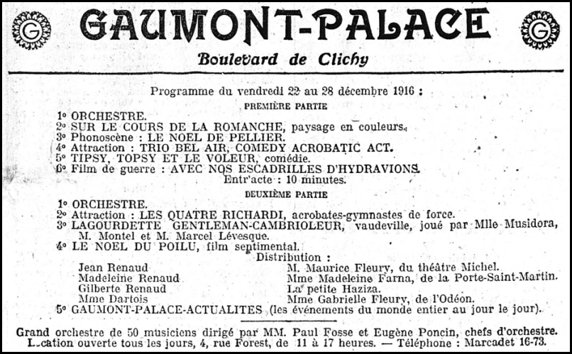Surtout, quelques publications4 donnent une toute autre distribution (hélas, toujours réduite à la portion congrue), confirmée par les archives Gaumont et la presse de l’époque :