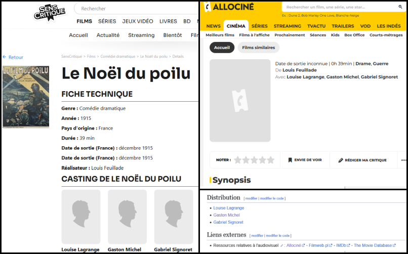 Qui plus est, il y a un vrai problème d’identification des acteurs donnés dans les listes disponibles partout sur internet, à commencer par Wikipédia, Sens Critique ou Allociné3 : Gaston Michel comme Gabriel Signoret sont méconnaissables dans le film.