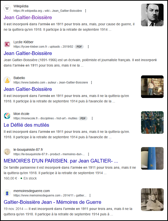 Il est toujours intéressant de constater la force du copier-coller sur Internet. La biographie proposée dans Wikipédia comporte deux erreurs, largement recopiées. De la classe 1911, Galtier-Boissière est bien appelé en octobre 1912 et seulement pour deux ans. Il devait être libéré fin septembre 1914, d’où le sous-titre « 63 au jus » d’un des chapitres de La Fleur au fusil.