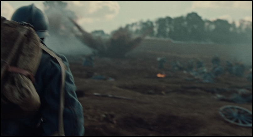 On retrouve le père et le fils en France en direction du front. Premières images de la boucherie : une carcasse de vache à côté de soldats qui ne s’en occupent pas ; un tombereau rempli de cadavres tiré par un cheval qui avance péniblement. L’opposition est bien visible avec la période précédente.
