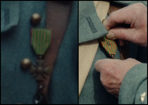 Mais un point est à évoquer : le ruban de la médaille. Normalement, il s’agit d’un ruban qui alterne rouge et vert. Or, on voit nettement dans un des deux cas que le ruban semble jaune et vert. Il est probable que cette couleur soit le fruit de l’application de filtres et du grain de l’image et non d’une erreur d’accessoiriste. D’autant que lors de la seconde décoration, on voit bien que c’est le bon modèle de ruban.
