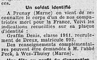 Étonnant parcours du corps de ce soldat mort de ses blessures, inhumé, dont la sépulture fut perdue jusqu’en 1923. Cette redécouverte fit l’objet d’une « publicité » de la part d’un abbé chargé d’identifier les corps.