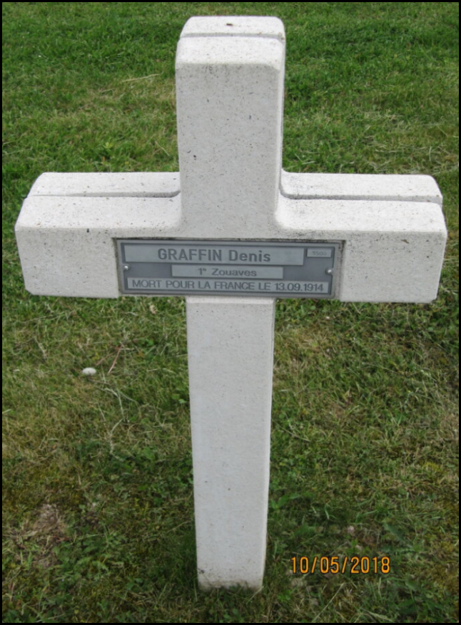 Le parcours de Denis Graffin commence par sa naissance dans une famille marquée par les décès d’enfants en bas âge ou à la naissance et à la mort de sa mère alors qu’il n’a que sept ans. Il est un élève peu assidu, son niveau étant de 1 lors du recensement. Il devient domestique de ferme. Il rejoint en octobre 1912 le 102e RI mais est volontaire pour rejoindre le Maroc. Il est affecté au 1er Régiment de Zouaves à partir de septembre 1913. Il est en zone de guerre un an. Quand la guerre est déclenchée en Métropole, il est rapatrié en France et meurt des suites de ses blessures à Prunay (Marne) le 13 septembre 1914. Difficile d’établir les circonstances de sa blessure, l’identification de son unité exacte étant compliquée et le 1er Régiment de Zouaves de Marches n’ayant pas de JMO pour cette période.